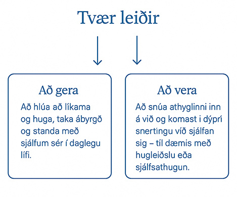 Það eru í raun tvær leiðir til að efla sjálfsvirðingu. Sú fyrri er að gera – að taka ábyrgð á eigin lífi, hlúa að líkama og huga og standa með sjálfum sér í daglegu lífi. Sú seinni er að vera – að beina athyglinni inn á við og komast í dýpri snertingu við sjálfan sig, til dæmis með hugleiðslu eða sjálfsathugun, og að lifa í núinu.